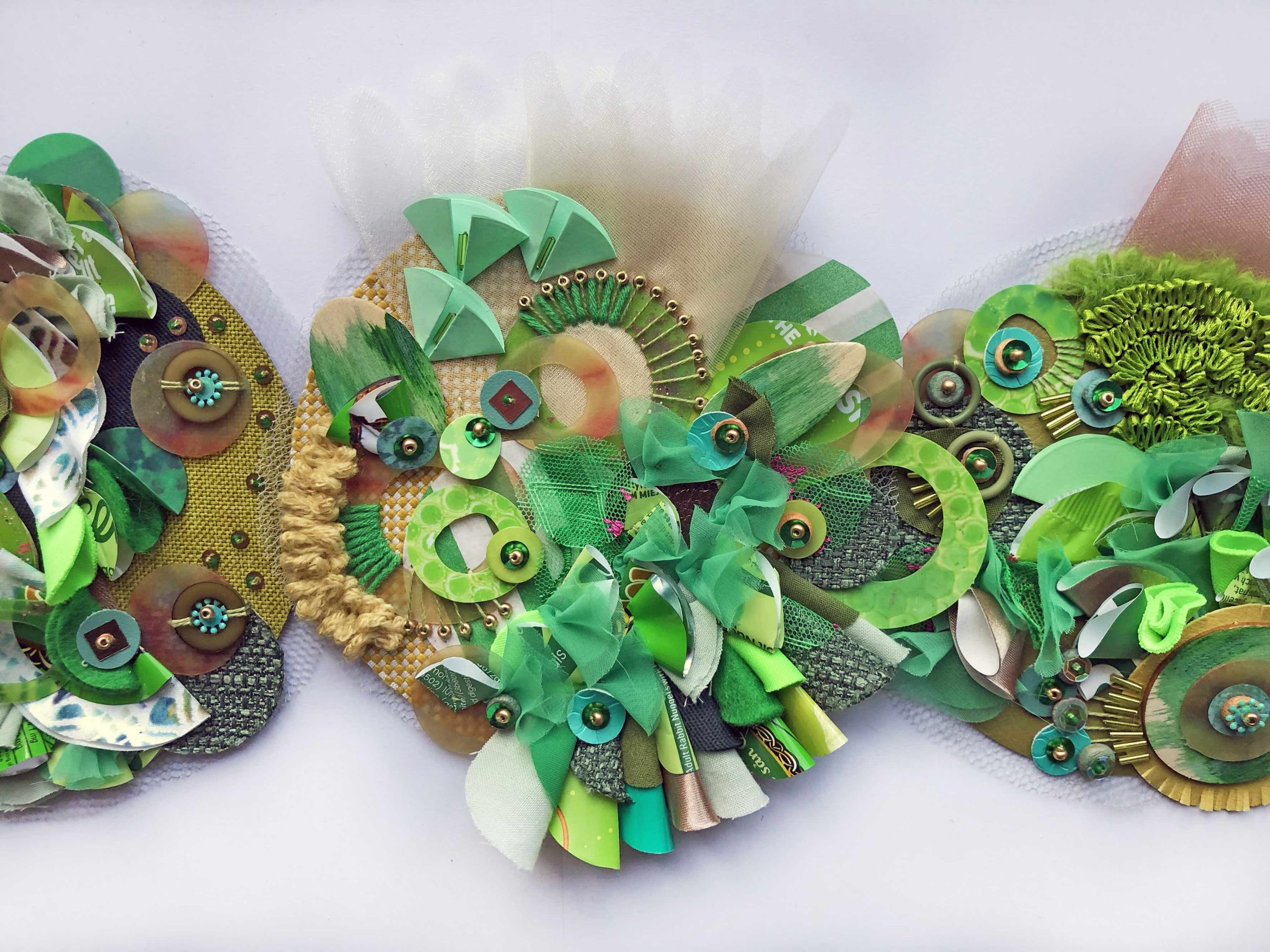 Jessica Grady is an embroidery artist, workshop tutor and author from West Yorkshire. Her colourful and contemporary hand stitched and embellished artwork uses recycled materials to create 3D textiles. She teaches her skills to others across the UK and beyond.